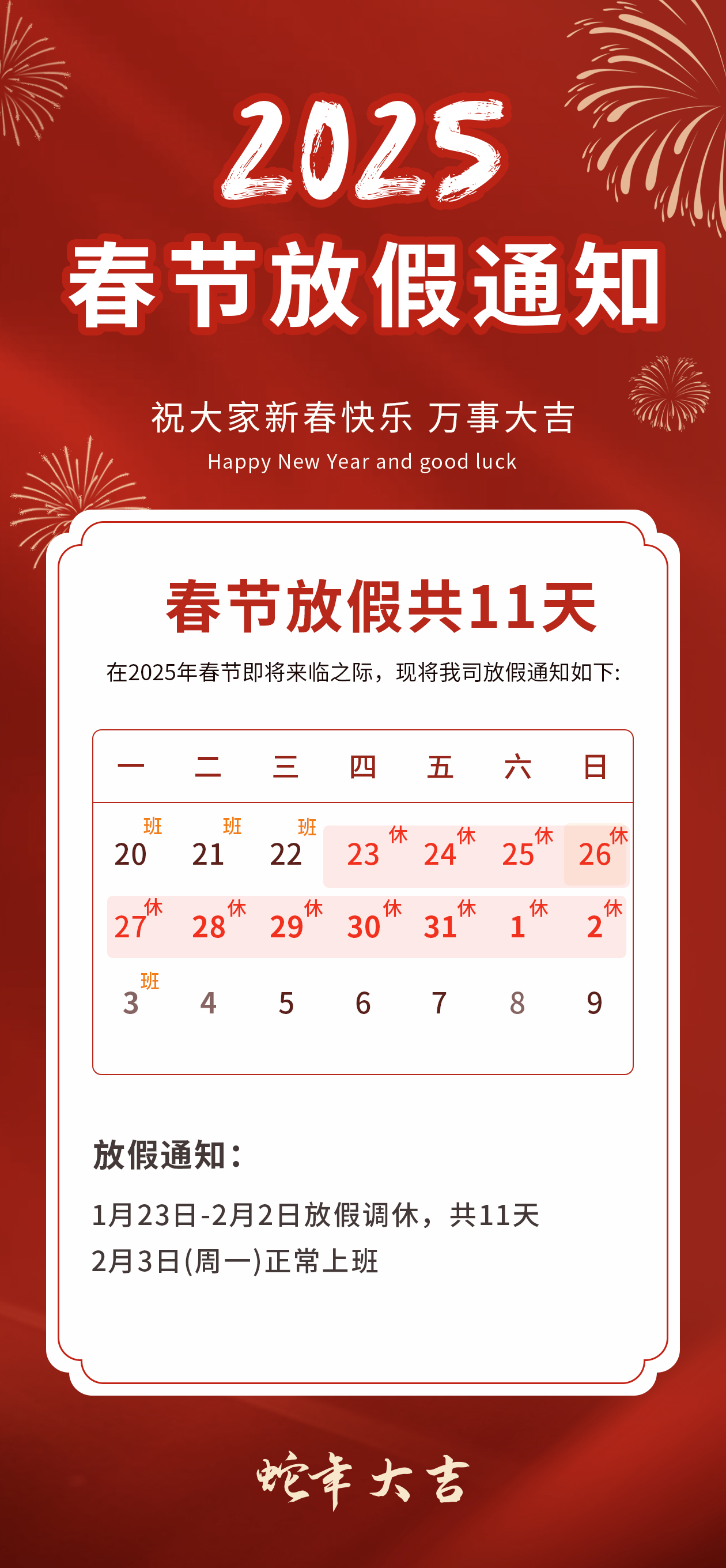 正值中國的傳統節日"春節"來臨,在此向各位新老客戶和廣大朋友們拜個早年!預祝大家新春愉快!財源廣進!事業紅火!為了讓公司員工過一個歡樂祥和的春節,將對春節假日提前和延長,現將公司春節放假時間通知如下:2025年1月23日(農歷臘月二十四)~2025年2月2日(農歷正月初五)(共計11天),2月3日(農歷正月初六)正式上班。