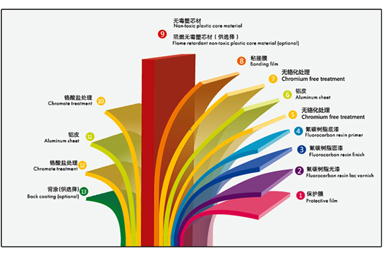 5、按照鋁塑復合板國家標準 GB/T17748-1999生產的氟碳外墻板,涂層采用70%的氟碳樹脂,在正常氣候環境條